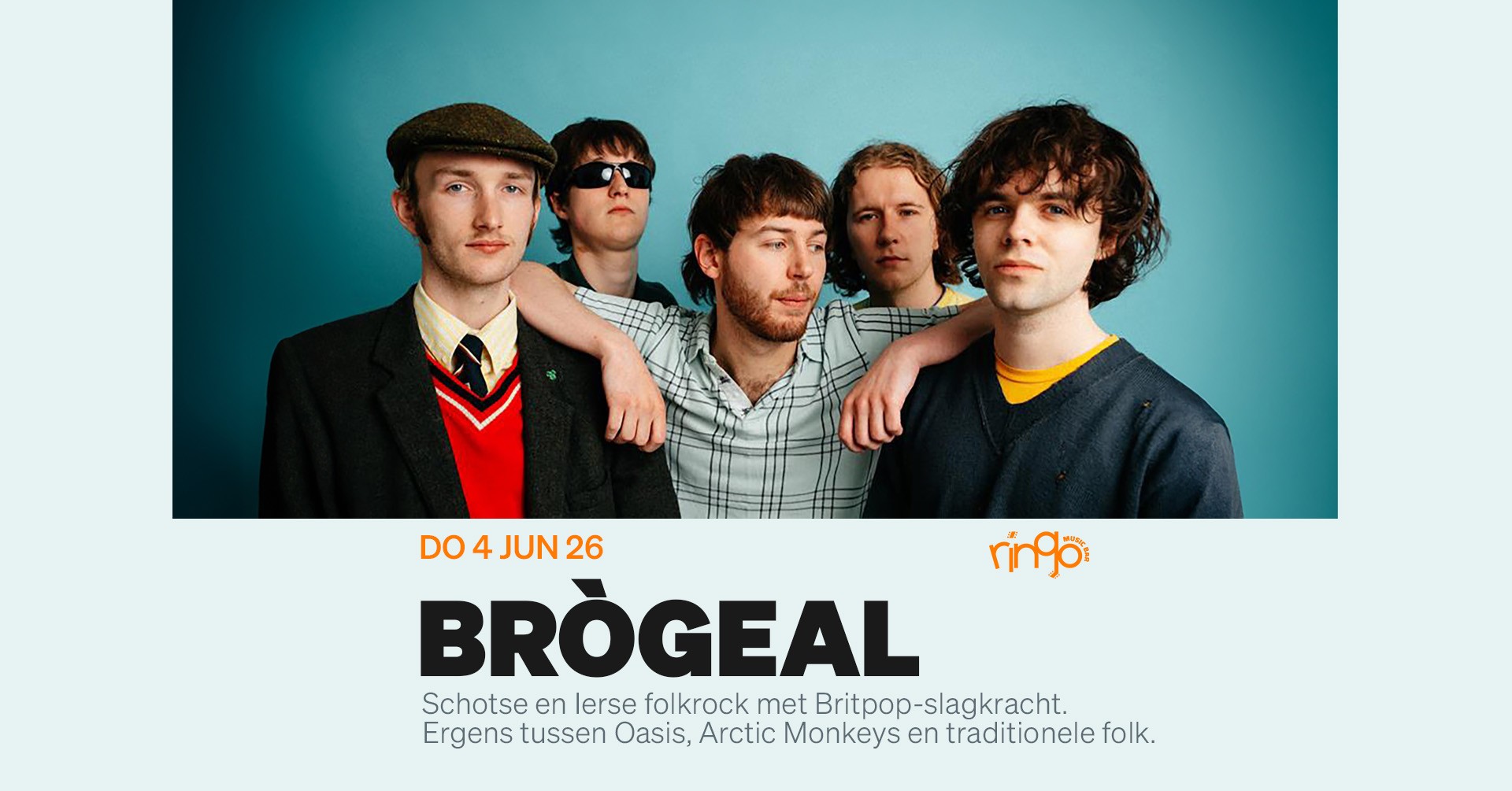 De Schotse band Brògeal komt op 4 juni naar de Ringo. Verwacht Schotse en Ierse folkrock met een randje Britpop à la Arctic Monkeys en Oasis, gebracht door een band waarvan de leden duidelijk hechte vrienden zijn. In mei presenteert de band hun goed ontvangen debuutalbum Tuesday Paper Club dat is opgenomen op het Schotse eiland Isle of Lewis in een visverwerkingsfabriek die is omgebouwd tot studio, een setting die meteen tot de verbeelding spreekt.