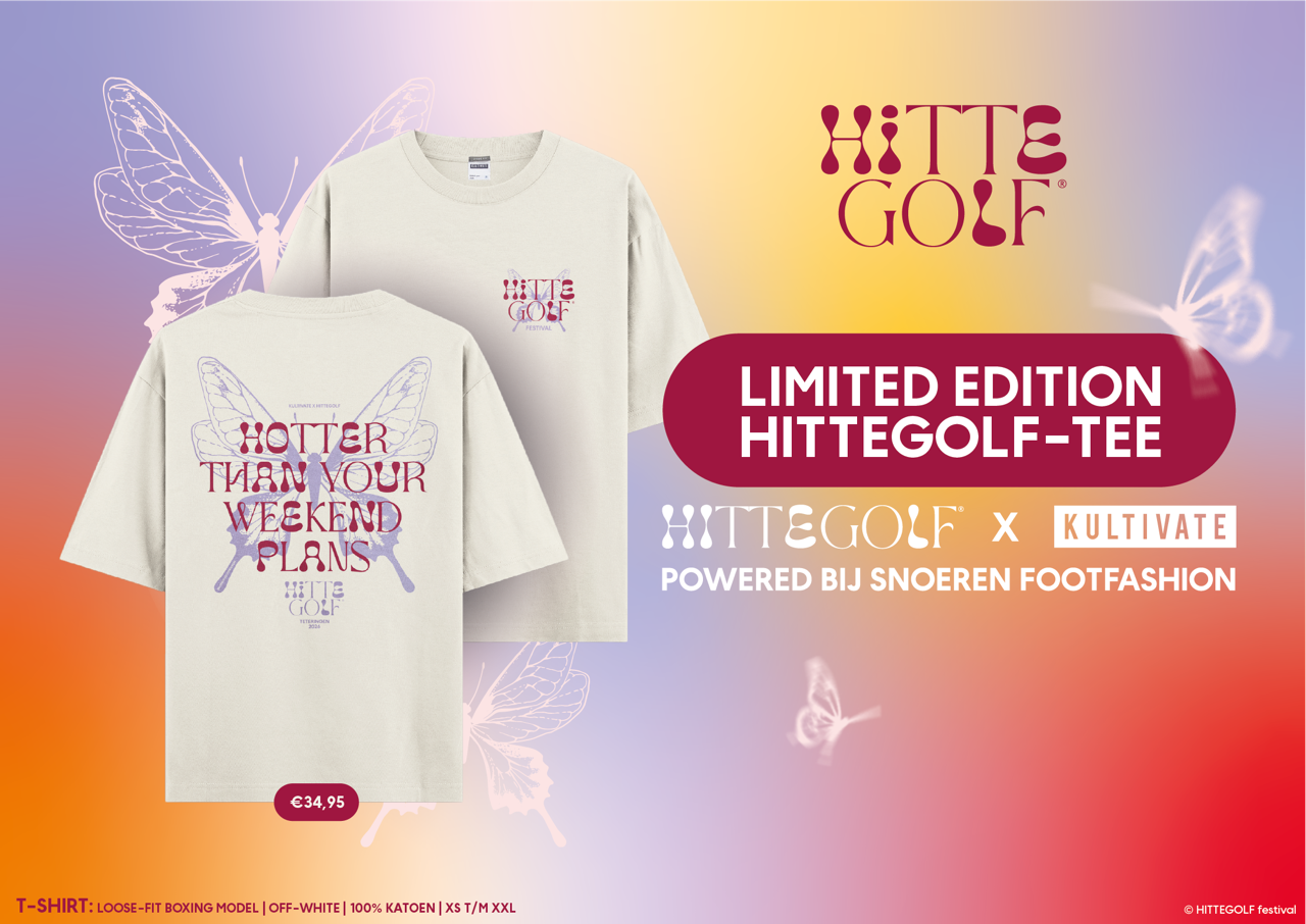 Voor HITTEGOLF festival 2026 slaan we de handen ineen met SNOEREN FOOTFASHION en het Nederlandse streetwearlabel KULTIVATE. Samen hebben we een uniek festival t-shirt ontworpen. Voor €34,95 is dit limited edition t-shirt van jou! (i.p.v. de normale prijs van €49,95) Bestel je shirt eenvoudig online en haal het op bij Snoeren in Teteringen. Liever direct meenemen? Het shirt is ook verkrijgbaar in de winkel bij Snoeren.